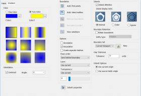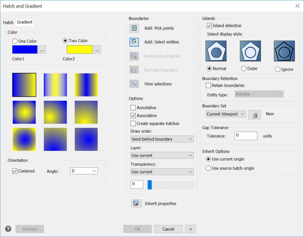 Farbverläufe können über eine benutzerfreundliche Oberfläche angezeigt und erstellt werden. Der Schraffurdialog wurde überarbeitet.
